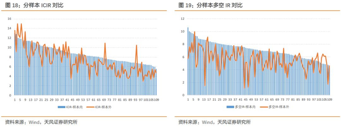 类似的,因子在样本内外多空收益IR对比图如下所示。因子多空IR整体在样本外出现一定程度下滑,平均值从7.14下降到5.56,中位数从7.02下降到5.65。但从多空IR维度评估,因子在样本外仍然保持着显著的选股能力。