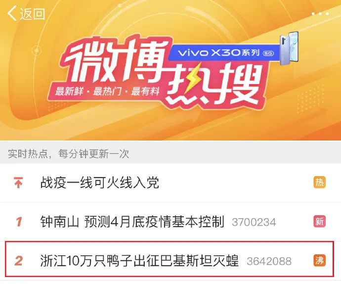 27日,一条内容为“浙江10万只‘鸭子部队’可能代表国家出征巴基斯坦灭蝗”的新闻登上了微博热搜榜。