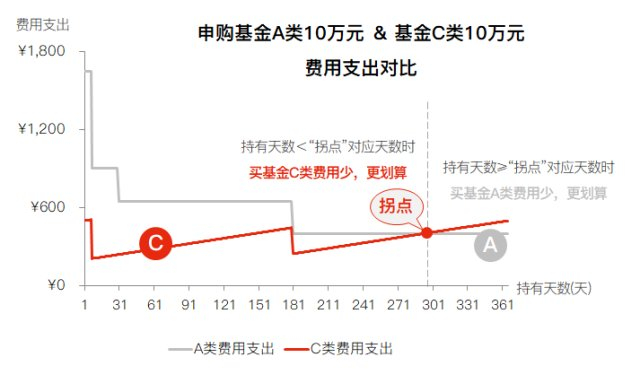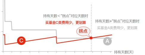 从图中可以看出,有个“拐点”即A类和C类的费用相等时,之前都是C类更划算,但如果继续持有,则A类更划算。