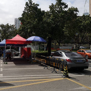 (医院大门被半封锁,留出两条测体温的通道)