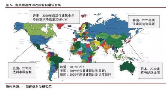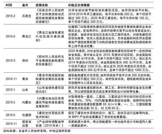 国内推出多项政策支持绿色建筑发展。中国广义建筑用能已占全社会总能耗的30%~40%,推动建筑节能已势在必行。根据2017年出台的《建筑节能与绿色建筑发展“十三五”规划》,到2020年,城镇新建建筑能效水平将比2015年提升20%,城镇新建建筑中绿色建筑面积比重将超50%,绿色建材应用比重将超40%,城镇可再生能源替代民用建筑常规能源消耗比重将超6%,中国城市中BIPV可应用面积将达17.9亿平方米,建设超低能耗、近零能耗建筑示范项目将达1000万平方米以上。同时,多个省市相继出台相关政策,支持超低能耗绿色建筑的发展。