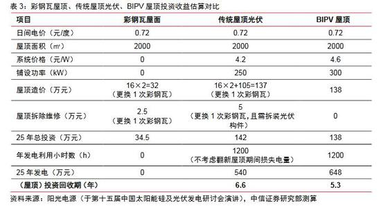 晶硅组件在部分BIPV屋顶项目中已具经济性。随着晶硅太阳能技术成本持续下降,性价比优势快速反超薄膜技术,晶硅BIPV在无透光(或半透光)要求的光伏屋顶领域经济性稳步提升。以面积为2000平方米的新建屋顶为例,BIPV组件将电池组件与屋顶材料结合,可替代工业厂房彩钢瓦屋顶的组件产品,节省下传统屋顶材料花销;虽然目前BIPV组件较传统光伏组件一般贵0.3-0.5元/W,但BIPV屋顶装机功率密度更高,同时25年以上寿命远超彩钢瓦屋顶的10-15年,BIPV屋顶发电收益可在6年内回收投资,性价比已超过传统的BAPV屋顶模式,且更美观。若考虑各地相关部门对超低能耗绿色建筑的财政补贴及优惠政策,BIPV屋顶投资回报率或更加可观。