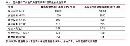 工商业屋顶有望成为BIPV市场突破口。与户用屋顶相比之下,工商厂房及物流仓库屋顶单体面积较大、标准化程度较高,且国内工商业电价普遍高于居民电价,投资回报率较高,有望成为BIPV规模化推广的市场突破口。以隆基股份和东方日升的实际项目测算来看,非自建项目投资回收期约7.4年,自建项目投资回收期仅约5.1年,对应内部收益率或达12%以上,且业主可通过BIPV全生命周期发电收益形成利润收回单层厂房的建筑投资。