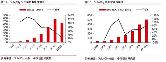 SolarCity是美国领先的户用光伏电站经销商。SolarCity成立于2008年10月,是美国一家专门发展家用光伏发电项目的公司,其联合创始人林登·赖夫和彼得·赖夫为特斯拉CEO马斯克表弟,马斯克为SolarCity董事长和最大股东。SolarCity发展之初主要定位为户用光伏电站经销商,提供从系统设计、安装以及融资、施工监督等全面的太阳能服务。得益于美国光伏市场快速增长和公司推出极具吸引力的低门槛太阳能体验,SolarCity创立早期迎来快速发展,并于2012年12月登陆纳斯达克上市。