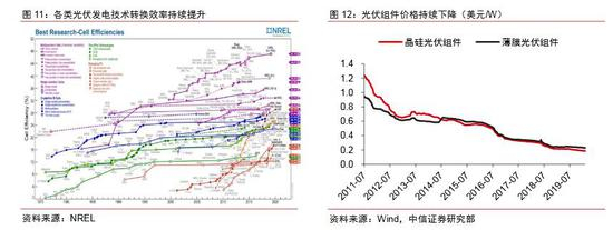 薄膜BIPV多用于光伏幕墙,但仍难以大规模推广。光伏幕墙多用于高端商业楼宇或示范性项目,业主对成本敏感性相对较低,更追求美观,薄膜电池技术凭借彩色透光、可弯折、易定制等优势,与光伏幕墙适配性强。但薄膜光伏幕墙目前成本仍较高,售价通常约1000-2000元/平方米甚至更高,按照发电功率80W/平方米测算,投资回收期一般需15-25年,现阶段仍难具备大规模推广基础。同时,虽然薄膜技术弱光性较好,但光伏幕墙搭建在建筑物外立面,光照倾角条件差,尤其是正午光强最强时照射角度反而越小,因此实际工作中薄膜光伏幕墙发电效果往往大打折扣,未来增长空间尚不明确。