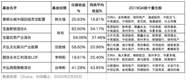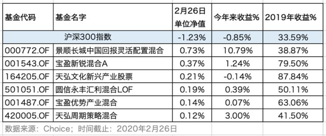 所以,司令整理了6只主动选股型基金供大家参考,今年来(截止2020年2月26日,下同)和2019年度收益都大幅领先沪深300。依次是景顺长城中国回报灵活配置混合、宝盈新锐混合A、天弘文化新兴产业股票、圆心永丰汇利混合LOF、宝盈优势产业混合、天弘周期策略混合。从今年来收益表现看,景顺长城中国回报涨幅10.79%,大幅领先沪深300;从2019年收益表现看,天弘文化新兴产业和宝盈新锐混合A涨幅分别高达87.84%和79.50%。