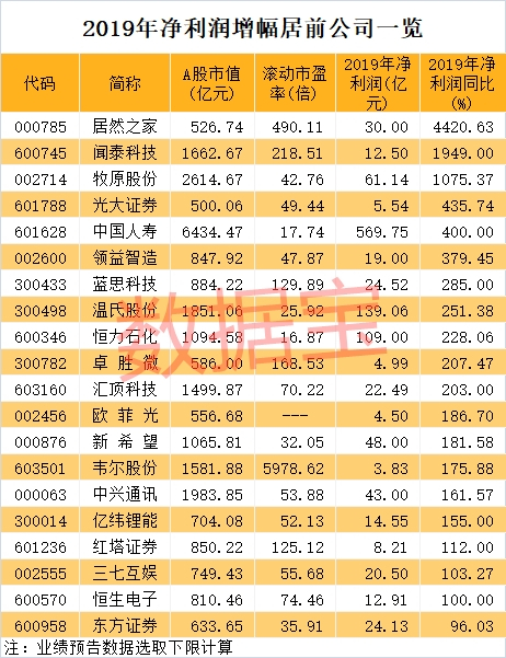在众多已经披露业绩的行业龙头股中,不少公司业绩喜人,智飞生物只是其中一例。经证券时报·数据宝统计发现,按照年报、快报和预告净利润下限计算,A股市值超500亿元且去年净利润有望同比增长30%以上的股票共计61只。3股净利润有望增长10倍以上,分别包括居然之家、闻泰科技、牧原股份。