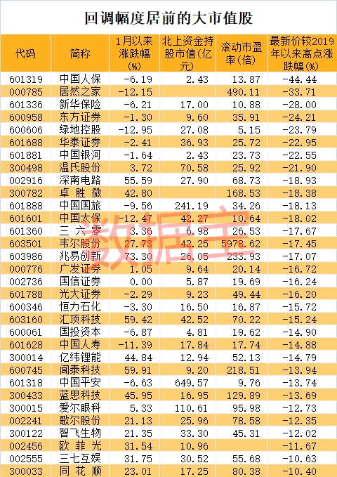近日一大批上市公司扎堆披露业绩快报,白马股业绩再次引发普遍关注。在业绩有望大增的大市值股中,32股较2019年以来高点回落10%以上,其中8股回落幅度超过20%,中国人保回落幅度最高,回落幅度达到44.44%。