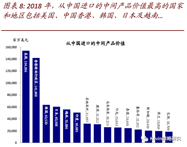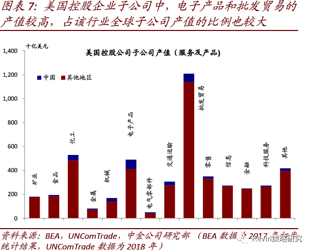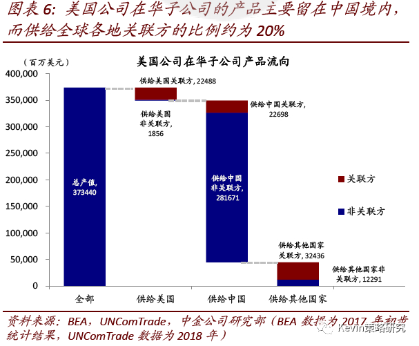 3) 从供应链情况看,2017年美国公司在中国大陆下属机构提供的产品和服务规模为3734亿美元,其中82%供应给中国境内的外资关联方或其他企业,12%供应海外其他地区、约6 %供给美国本土母公司或其他企业。我们根据合理推测,供给关联方产品可能大体属于中间产品,这一部分约占总产值的20%,而剩下的80%中可能也有相当比例为中间产品,因此说明对全球产业链将产生一定影响。