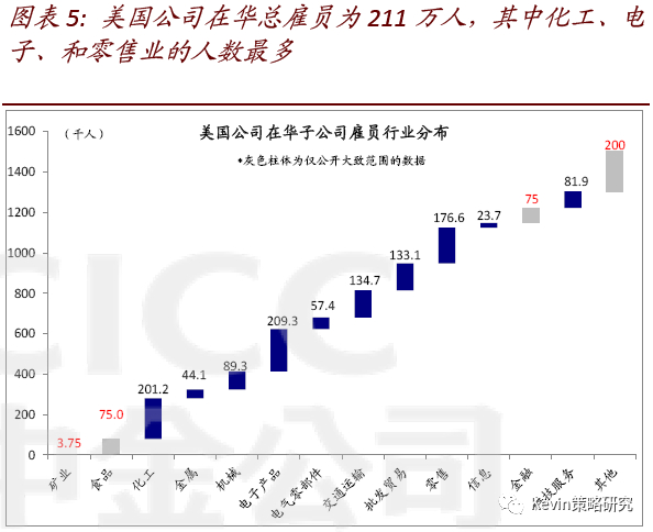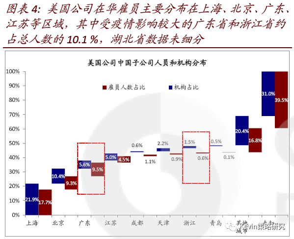 1) 分地区看,美国企业雇员主要分布在上海、北京、深圳、苏州、广州等地。其中,疫情较为严重的广东尽管机构占比5.6%,但雇员人数占比更高达到9.5%;浙江则是机构占比(1.5%)较雇员高(0.6%)。虽然湖北省的雇员和机构数没有细分数据,但上述数据显示受到较大影响的整体雇员人数至少10%左右(图表4)。