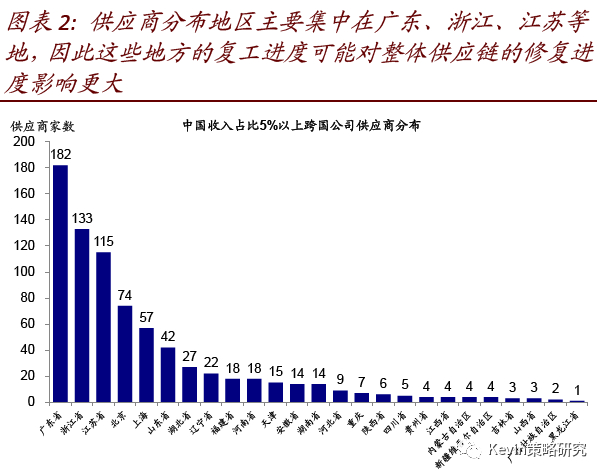 1) 整体来看,供应商较为集中在广东、浙江、江苏等地,因此这些省份的复工进度对跨国公司供应链的修复程度影响更大。