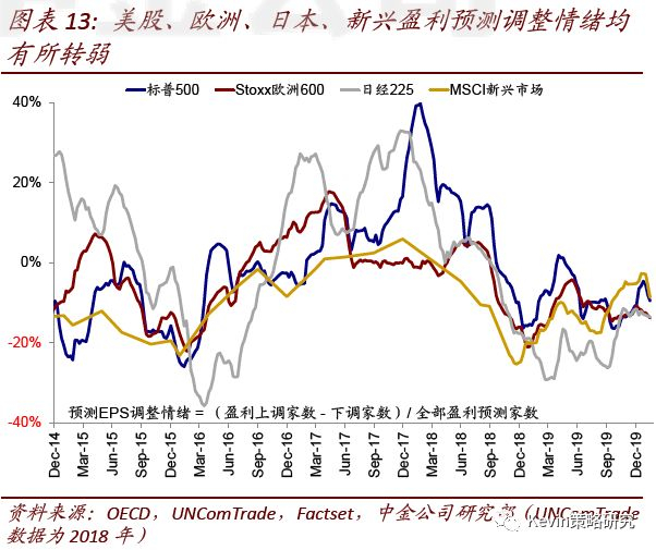 近期,我们注意到,疫情的潜在影响可能已经在盈利预期调整上得到一些体现,主要市场的EPS一致预期和盈利调整情绪都明显转弱,这和诸多跨国公司下调一季度指引所反映的情形一致。以美股为例,虽然2019年的盈利预期继续上调,但2020年则出现下调。因此,在当前估值已经偏高的背景下,疫情对基本面的影响程度和持续时间尤为关键,需要密切关注盈利下调对市场的可能影响。
