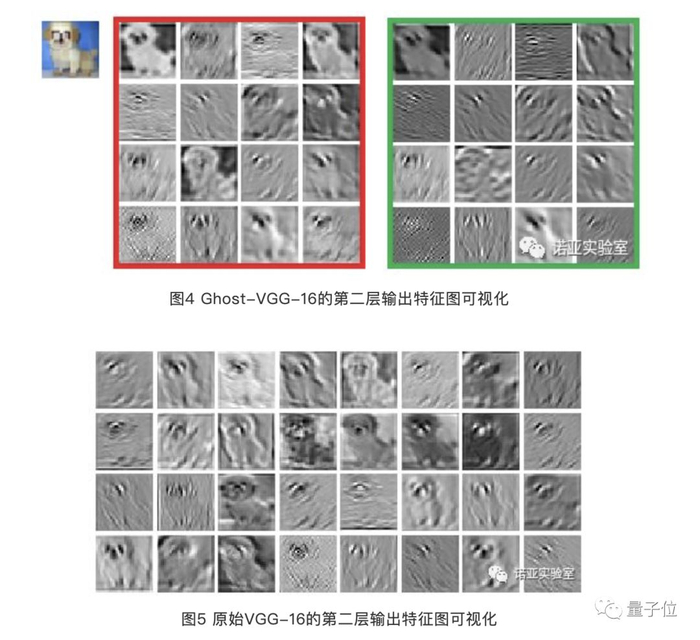 在论文中,他们提供了Ghost模块生成的特征图。下图展示了Ghost-VGG-16的第二层特征,左上方的图像是输入,左红色框中的特征图来自初始卷积,而右绿色框中的特征图是经过廉价深度变换后的幻影特征图。