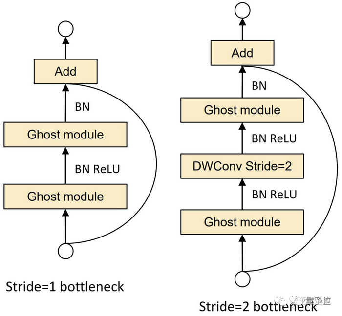构建新型端侧神经网络架构GhostNet利用Ghost模块的优势,研究团队提出了一个专门为小型CNN设计的Ghost bottleneck(G-bneck)。其架构如下图所示,与ResNet中的基本残差块(Basic Residual Block)类似,集成了多个卷积层和shortcut。
