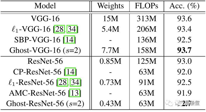Ghost-VGG-16 ( s=2)以最高的性能(93.7%)胜过竞争对手,但算力消耗(FLOPs)明显减少。在比VGG-16小得多的ResNet-56上,基于Ghost模块的模型,将计算量降低一半,还能获得可比的精度。