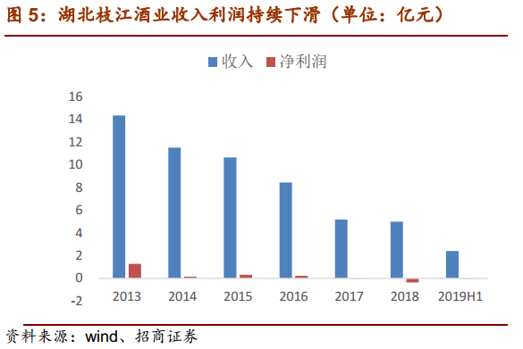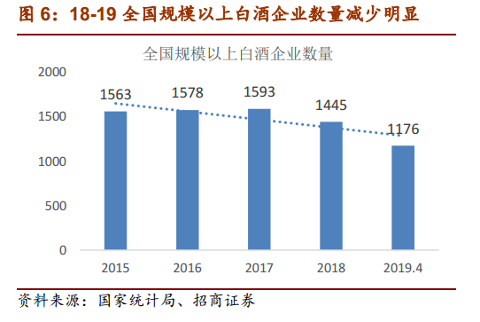 区域市场分化明显,龙头持续增长,二三线品牌份额被挤压,中小酒企数量减少。本轮周期以来,区域市场分化严重,地产龙头连续多年持续增长,而区域二三线则被挤压市场份额,销量萎缩,难以翻盘。以安徽为例,15年至今,四家白酒上市公司里,古井口子两大龙头的份额持续提升,其他酒企份额在下降。再比如湖北,龙头白云边销售额持续增长,2018年收入达45.82亿元,而湖北枝江酒业,13年被维维收购后,收入利润逐年下滑,份额持续萎缩,其他中小酒企的日子则更难过。统计局数据显示,2017年中国白酒行业规模以上企业数量为1593个,2018年规模以上白酒数量为1445家,比上一年减少148家,2019年4月最新数据显示,规模上企业进一步减少到1176家,相比2018年底减少了269家,亏损企业数量进一步扩大。