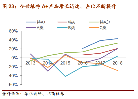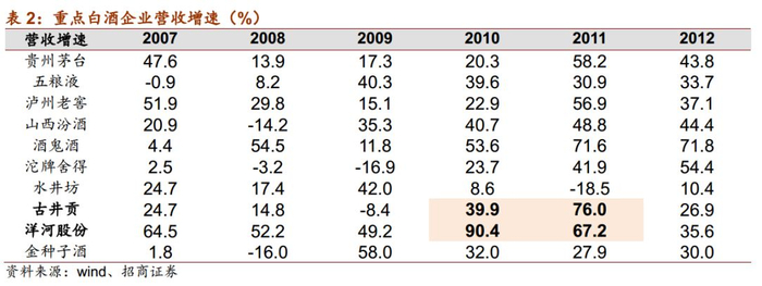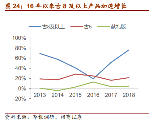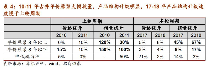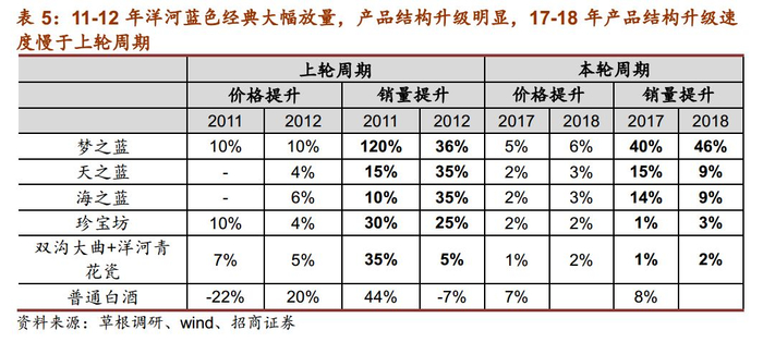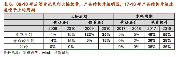结构大幅升级带来上轮地产酒高弹性。上轮周期中,09-11年地产酒崛起,主要系经济驱动,上轮白酒周期由于商务、投资活动较多,政务和商务消费主导中高端白酒的需求,对价格敏感度较低,表现出消费层次和产品价格不断提升,推动地产酒产品结构快速升级,核心产品快速放量。古井年份原浆系列10-11年销量增速超100%,收入占比从09年的26%迅速提升至11年的64%;洋河梦之蓝11-12年销量增速分别为120%、36%,海、天也保持两位数增长,蓝色经典系列12年占比达73%;汾酒青花系列09-10年销量增速分别为122%、25%,占比从09年的22%提升至11年的29%,产品结构升级明显,带来业绩高弹性。