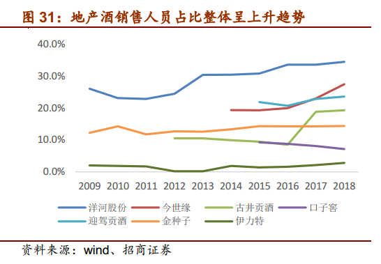 2)渠道要不断往下沉,接地气。上文已就洋河、古井为例,对地产酒的深度分销能力进行了详细阐述,在此不再赘述。地产酒是渠道拉动的产品,相较于一线名酒,地产酒的优势主要体现在区域渠道上的精耕细作,终端上的强势掌控,并借助渠道优势在主市场达到滚雪球效应,从而在一个区域做到最精细、最大化,不断提升市场份额。地产酒需做好渠道下沉、深度分销,所带来的是经销商数量的增长、销售人员数量的增长,这一点在洋河上体现尤为明显,2009-2018年,洋河的前五大经销商占比持续下降,销售人员比例持续增长,18年前五大经销商占比仅为4.2%,销售人员占总人员比例达到34.4%。古井受平台公司影响,前五大经销商占比有所波动,但近年来整体呈下降趋势,销售人员比例也进一步增加,18年占比达19.2%。而伊力特由于是买断经营模式,前五大经销商占比较高,销售人员数量也较少,完全由经销商去做市场,渠道较为粗放,与洋河形成鲜明的对比。苏酒和徽酒的精耕细作能力在全国酒企中遥遥领先,其他区域酒企可以学习参考其渠道模式。