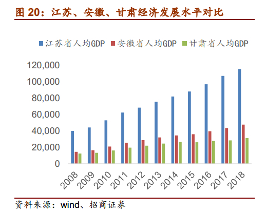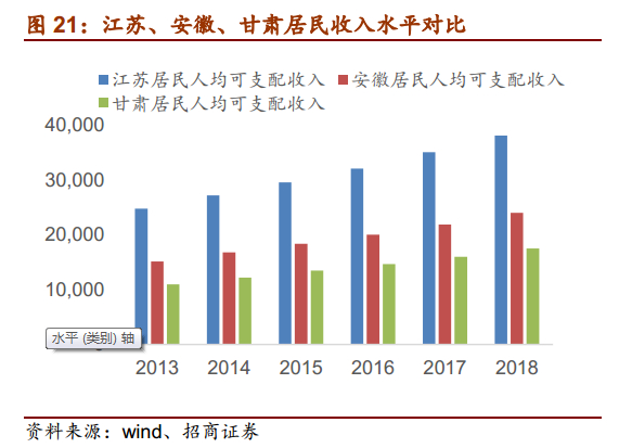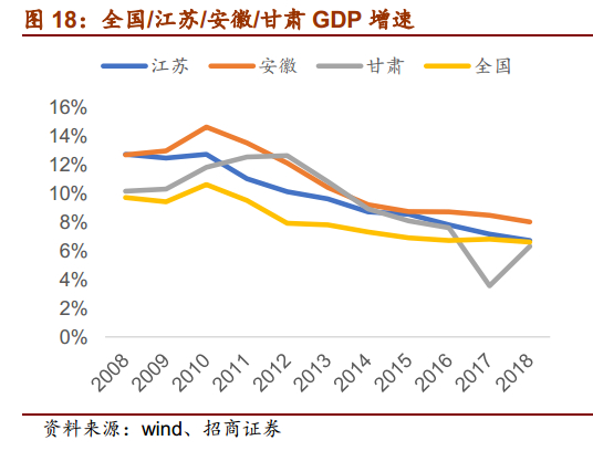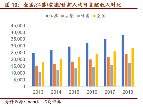 人均收入提升,大众消费持续升级。自15年白酒行业复苏以来,消费结构发生转变,消费需求由政商主导变为大众消费主导,经济发展、个人收入的提升使得主流消费价格带不断上行。近几年全国GDP仍保持稳健增长,增速在6.5%以上,人均可支配收入也逐年提升,分省份来看,江苏人均可支配收入水平在全国一直处于前列,2018年突破3.8万元/年,同比增长8.77%。安徽稍弱于全国水平,18年收入水平达到2.4万元/年,同比增长9.70%。甘肃1.7万元/年虽低于全国水平,但维持着9%左右的高增长率,支撑消费能力进一步提升。