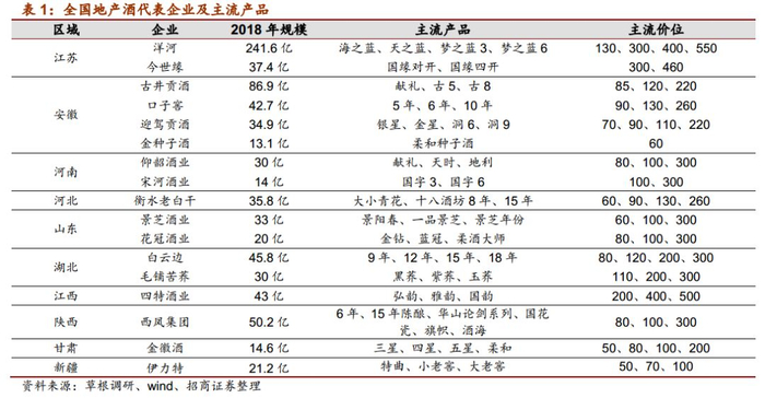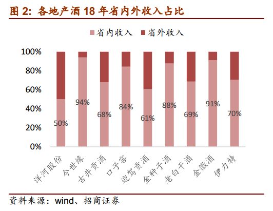 洋河目前实为全国性白酒品牌,但省内仍占较高比重,且公司是地产白酒基础及模式发展的典范,对其他地产白酒企业有重要借鉴意义,故纳入本文探讨范围。
