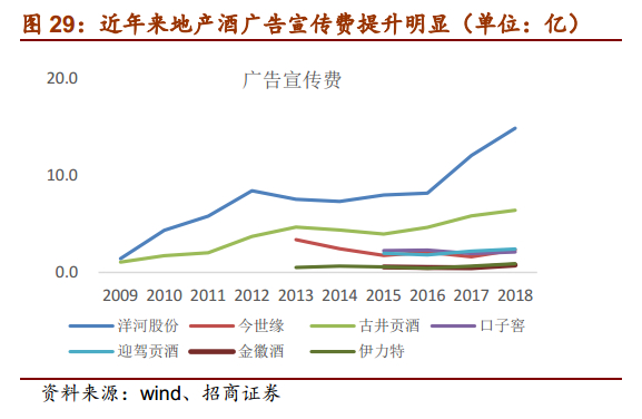 洋河自身的努力,让自己脱颖而出,通过内外共振、地空结合的营销方式持续提升品牌力。公司通过事件、外加场外传播(如演唱会)协同地面促销多角度推进品牌建设,通过加强与央视合作,并选择位置好的区域、覆盖面大、上档次的优质媒体进行宣传营销,进一步塑造洋河品牌形象,提升内容价值和品牌价值,打造民族品牌。公司08年广告宣传费约为1亿元,到12年高达8.5亿元,年均复合增速达68%。洋河当时高广告费用的投放方式成效显著,在白酒市场刮起一股蓝色风暴,2011年省外市场实现销售同比增长84.56%,在全国34个省级市场中,有22个省级市场全年销售超亿元,亿元地级市场由2010年的1个增加到2011年的7个,亿元县级市场从2010年的4个增加到33个,成功实现准全国化。此外,洋河在品牌打造上也很值得借鉴,洋河的蓝色经典系列层层递进,海之蓝—天之蓝—梦之蓝,构建了海—天—梦的概念,有很深的文艺内涵,也容易让消费者产生美好的联想,同时品牌宣传上也是按照海—天—梦的顺序依次来推进。