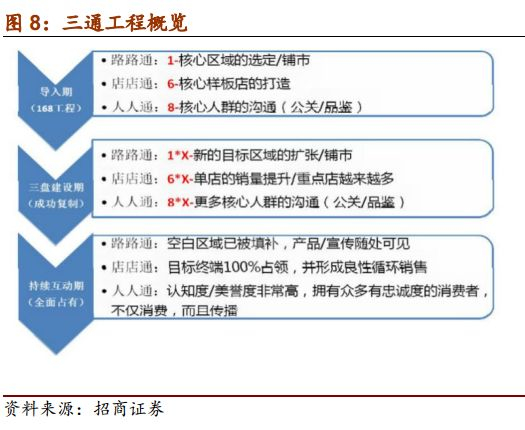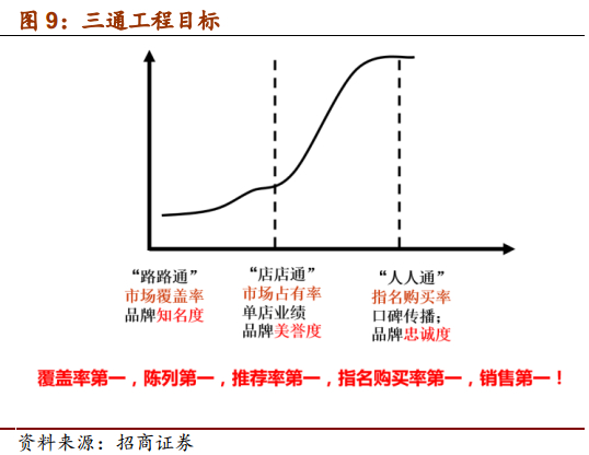 1)古井强力直控渠道,三通工程助力渠道下沉,弱化经销商职能。古井原本采取“大区经理-各地办事处-销售人员”销售体制,08年整改后,开始整合经销商资源,将原来的近1000家客户压缩到400余家,将安徽内销售大区从12个增加到19个,撤销城市办事处,对大区经理充分授权,实现了扁平化管理。同时09年推出三通工程,保证了公司对渠道的细致控制,也奠定了公司在合肥、亳州等核心市场的绝对领先优势。三通工程就是“路路通,店店通和人人通”,即小区域、高占有,在选定的区域内集中资源,建立规划、执行、督导三位一体的执行体系,通过精细化的网点建设和核心消费者意识的培养,构建渠道和消费者的良性互动,达到产品陈列面最大化、推荐率最大化、消费者指名购买率最大化,先在局部区域做到第一,然后进行成功复制,逐步扩大市场占领率,将版块连成一体,最终全面打开目标市场,做到市场销量领先。