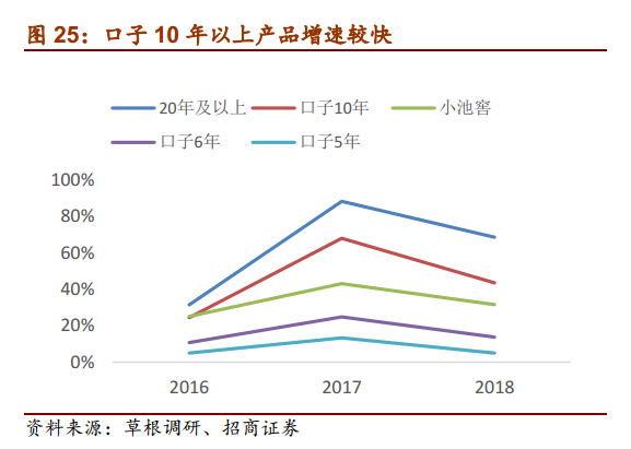 古井8年、口子10年以上产品增长迅速。草根调研反馈安徽省内消费升级趋势明显,200元以上产品增长迅速,18年古8及以上增速超70%,产品结构持续升级,高端占比不断提升,年份原浆18年收入占比已近80%,古8及以上占比近30%;口子10年等200元以上产品增长迅速,18年口子5年及6年占比由17年的60%+下降至50%+,小池窖及以上(小池窖、口子10年20年等)占比提升至45%以上,预计10年及以上产品占比在35%以上,产品结构升级明显。未来预计安徽将看齐江苏市场,300元价格带放量,古8、口子10年及以上产品预计仍将保持较快增速。
