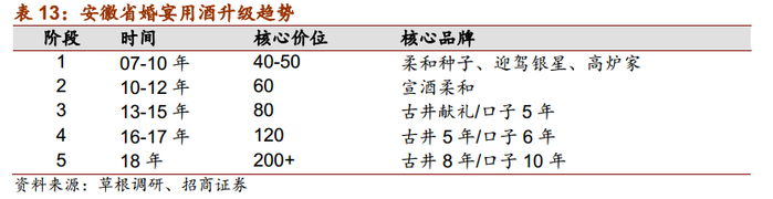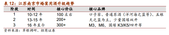 江苏已实现大众消费核心价格带向300元以上的升级。以经济较为发达的江苏省为例,当前江苏省已实现了大众消费核心价格带向300元以上的升级,江苏白酒核心消费价格带从2010年的100-200元提升至2017年250-400元。以江苏南京婚宴用酒为例,2010年,当地婚宴用酒核心价位带为100元左右,主要代表产品为口子窖、普通苏酒(洋河海之蓝等);13年开始升级到200多价位段,主流产品是天之蓝;16年之后,婚宴用酒升级到以梦3和梦6为代表的300元以上价位段。