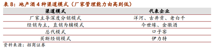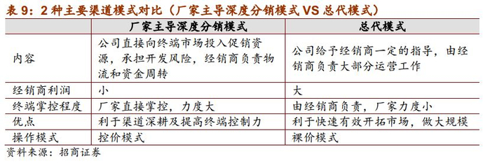 总代模式:公司在每个城市设有独家总经销,强化以经销商为主体负责公司产品的销售,主要代表是口子窖。公司给予经销商一定的指导,销售费用打包给总代,由经销商负责大部分市场运营工作,经销商利润高,属于裸价模式。