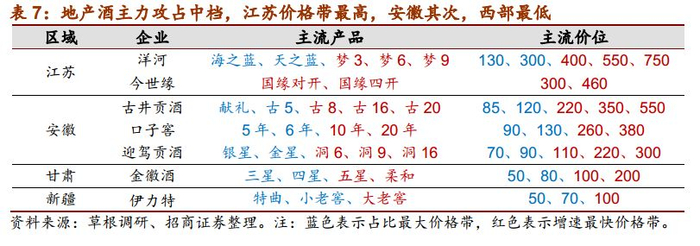 地区差异较大,主力攻占中档。不同区域的经济发展水平与白酒消费档次差异较大,整体来看,东部消费档次高于西部,东部几省里,江苏消费档次又为最高,价格全国领先。以洋河、今世缘为代表的苏酒主流价格带已升级到300元以上,以古井、口子窖为代表的徽酒正在向200元以上升级,西部地区经济基础较为薄弱,以金徽酒为代表的甘肃、伊力特为代表的新疆当前由100元以下向100元以上升级,主流价格带仍在百元以下。