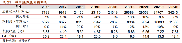 未来展望:仍是业内能力一流公司,预计来年进入稳健增长。洋河过去十年的持续投入和市场运作,已成为全国有名的次高端白酒品牌,尤其梦之蓝在华东及华中诸省有着众多口感养成的忠实粉丝,具备较强品牌力;“洋河+双沟”的双名酒品牌让公司在营销上可以采取更灵活的打法;新任销售公司董事长刘总业内口碑颇高,团队仍然是具备战略眼光和敢想敢为的一流团队。我们认为,本轮调整结束后,海/天基本盘稳住,未来增长将主要靠梦接力升级,若梦6+能成功替代梦6,则能打开海/天/梦3的升级空间。预计未来3年梦复合增速20%+,海天持平微增。预计今年报表季度增速仍有波动,前低后高,来年将进入稳健增长期。