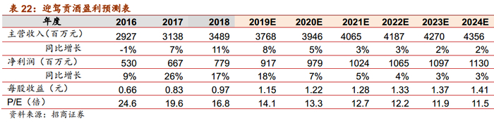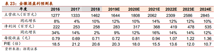 展望未来:期待公司进一步加大品牌投入,抓住消费升级趋势,更快提升份额。整体来看,在200元价格带,与古井、口子窖相比,迎驾洞藏的品牌力仍相对较弱,在百元以上价格带的市场份额也较低。展望未来2-3年,安徽省内200以上价格带仍将保持较高增速,受益价格带扩容,洞藏系列有望分享红利,考虑到古井口子在200价格带先发优势明显,期待公司能够进一步加大品牌和渠道投入,紧抓消费升级趋势,不断提升洞藏品牌力,持续培育消费者,进一步提升市占率。