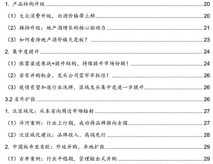 地产酒的突围之道(省内市场):“升级+集中”。1)换挡升级,发力高端。江苏当前升级到300元以上,安徽是向200元以上升级,西部地区升级到100元以上。展望未来,地产酒需紧握升级趋势,提前卡位更高价格带,防止被升级趋势甩下,同时用高端产品利润去做市场,不断加强品牌和渠道壁垒。从价格天花板上,地产白酒龙头需要依靠渠道深耕及地缘情节,突破全国性次高端白酒的价位封锁;2)省内集中度提升。地产酒需依靠渠道巷战+提升结构,持续提升市场份额,若有并购机会,龙头公司需牢牢抓住。此外,此次疫情有望加速行业洗牌,区域龙头集中度进一步提升。