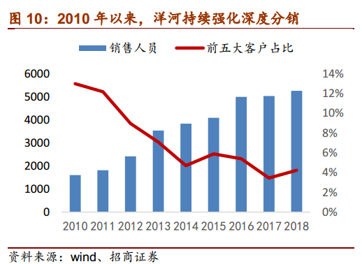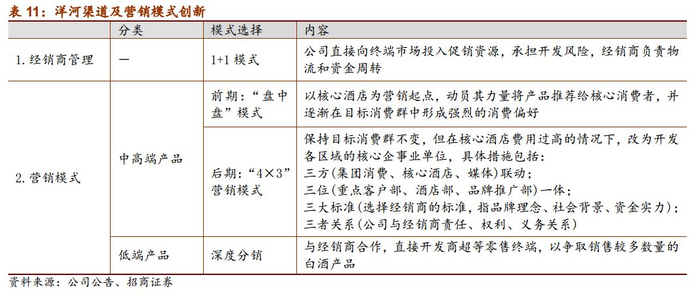 2)洋河创新提出厂商“1+1”模式,渠道深度分销,增强终端把控能力。02-03年,洋河在困境中学习口子窖“酒店盘中盘”的模式,运作重点酒店渠道(B类酒店以上),走出了困境。后由于酒店的进店费、开瓶费等各种费用越来越贵,加上顾客自带酒水现象严重,洋河提出了以“消费者盘中盘”为核心的新思路,将“终端”的概念从“终端的核心酒店”前移到了“核心消费者”,从而构造了以“团购公关”为核心思想的“启动小盘”模式。同时洋河还引入了快消品理念进入白酒销售渠道,打破酒企的大经销商制传统,创新性采用独特的厂商“1+1”模式、“4×3”后终端营销模式等,深耕渠道,取得了良好的效果。“1+1”模式让洋河实现渠道深度扁平化,省内至县、省外至地级市实现了一级经销商的全面布局,有效解决了终端营销针对性不强、效率不高的问题,摆脱了数年来由于终端恶性竞争造成的白酒混战,实现了渠道深度扁平化,增强了企业掌控市场的能力,在全国化的征途上把诸多对手甩在了身后。