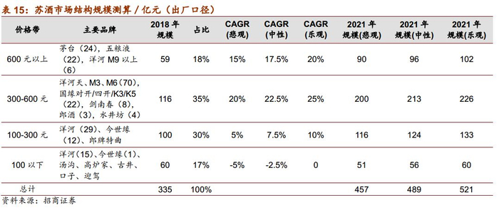 分价格带看,2018年600元以上、300-600元、100-300元、100元以下价格带规模占比分别约为18%、35%、30%和17%。江苏经济增长稳健,经济发展水平处于全国前列,未来随着经济的增长和居民可支配收入水平的提升,白酒消费价格带预计将继续上移,假设高端酒未来三年CAGR 15%-20%,次高端CAGR 20%-25%,中档酒CAGR 5%-10%,低档酒持平甚至下降,2021年江苏市场整体规模将达457-521亿元。