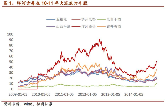 地产酒历史上股价弹性较大,曾出过牛股。最典型的案例是,上一轮白酒周期,在四万亿投资的驱动下,10-11年地产酒业绩迎来爆发式增长,洋河与古井贡股价也随之大幅上涨,洋河在一年左右时间股价大涨218%,古井则从12左右一路上涨至47,股价翻了近四倍,成为当年的大牛股。13-14年行业深度调整后,次高端酒企水井、沱牌等遭遇严重打击,洋河与古井仍然凭借良好的内部表现平稳过渡。