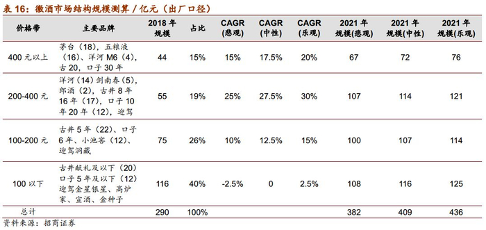 分价格带看,2018年400元以上、200-400元、100-200元、100元及以下价格带规模占比分别约为15%、19%、21%和45%。随着安徽经济持续增长,居民消费能力提升,消费核心价格带预计将继续上移,假设高端酒CAGR 15%-20%,中高端CAGR 25%-30%,中档酒CAGR 10%-15%,低端酒增速放缓甚至下降,2021年安徽市场整体规模将达382-436亿元。