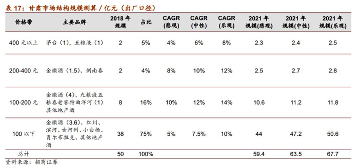 分价格带看,其中400元以上、200-400元、100-200元、100元及以下价格带规模占比分别约为5%、4%、16%和75%。随着甘肃经济的发展,居民消费能力将持续提升,未来白酒核心价格带也将往上走,假设高端酒CAGR 5%-8%,中高端CAGR 8%-12%,中档酒CAGR 10%-14%,低端酒CAGR 5%-10%,2021年甘肃市场整体规模将达59-68亿元。