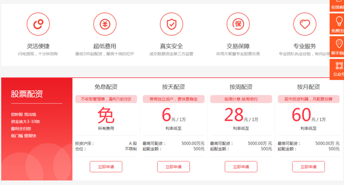同时,线上配资给出的方案也灵活多样,其中最为常见的收费配资。杠杆普遍为2-10倍,配资周期灵活,投资者可按需选择日、周、月。以一家名为“盛鹏配资”的平台为例,10倍配资按日、周、月分别计算,折合月息分别为1.8%、1.12%和0.6%。