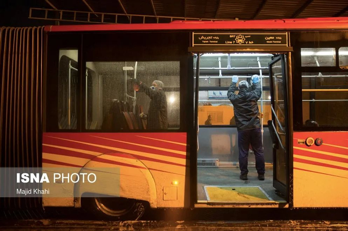 伊朗清洁人员在为公交车消毒 伊朗学生通讯社 图