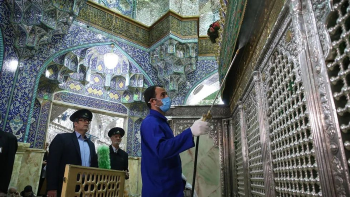 伊朗清洁人员为清真寺消毒 法国24电视台 图