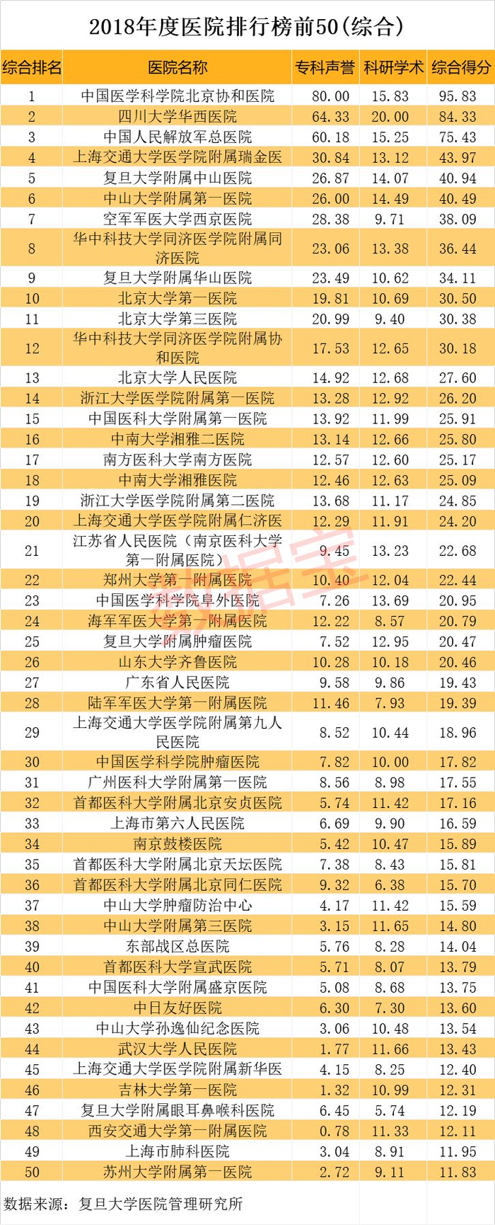 复旦大学医院管理研究所从2010年开始,每年推出上一年度的全国医院排行结果。复旦大学医院管理研究所公布的《2018年度中国医院综合排行榜》数据显示,从全国各城市入围百强三甲医院数量来看,北上广处于第一方阵,第二方阵则由武汉、西安、杭州、重庆占据,成都与南京紧随其后,沈阳、长沙、济南和天津三甲医院的排名也均不俗。具体名单见下表: