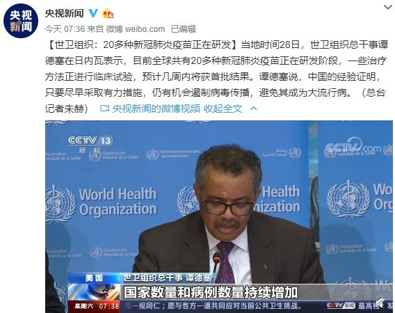 世卫组织总干事谭德塞指出,现在中国以外地区才是最大担忧,全球疫情处于关键时刻,建议各国迅速采取行动。当地时间2月28日,世卫组织总干事谭德塞在日内瓦表示,目前全球共有20多种新冠肺炎疫苗正在研发阶段,一些治疗方法正进行临床试验,预计几周内将获首批结果。谭德塞说,中国的经验证明,只要尽早采取有力措施,仍有机会遏制病毒传播,避免其成为大流行病。