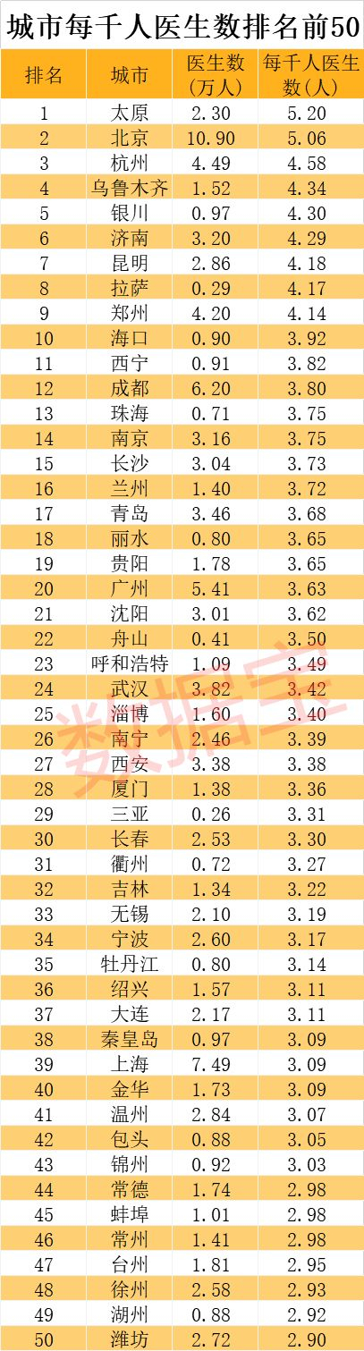 从每千人医生数量来看,太原每千人医生数5.2人排名百座城市第一位。太原是山西省省会、太原都市圈核心城市,国务院批复确定的中国中部地区重要的中心城市。2018年末太原常住人口442.15万人,执业(助理)医师23018人。北京每千人医生数5.06人排名第二位,杭州每千人4.58排名第三位。排名前十位的依次还有乌鲁木齐、银川、济南、昆明、拉萨、郑州、海口。此外,唐山、九江、赣州、南充、汕头、湛江、肇庆、泉州等9市每千人医生数不足2人排名靠后。