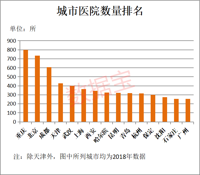 数据宝统计发现,在医院数量规模方面,重庆、北京、天津、武汉、上海入围前五位,其中重庆以800所医院位列百座城市第一位,北京以736所医院排在第二位,成都以606所医院排在第三位。入围前十位的还有上海、西安、哈尔滨、昆明、青岛,其中青岛为非省会城市,不过是山东副省级城市,也是计划单列市,是山东省唯一GDP超万亿元的城市。相比之下,同为GDP万亿元俱乐部成员的长沙、深圳、宁波、无锡、佛山等城市医院数量不足200所。