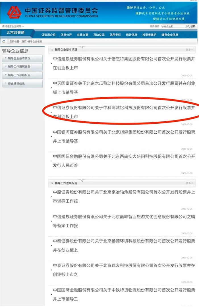 据北京证监局网站披露的上市辅导基本情况表,寒武纪和中信证券于2019年12月5日签署了上市辅导协议。
