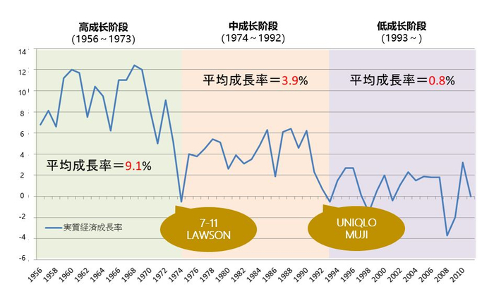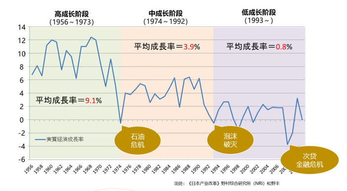 从图中可以非常清晰地看到,日本GDP的增长率在过去的几十年间,非常清晰地经历过三个阶段,分别是从1956年到1973年的高成长阶段,1973年到1992年的中成长阶段,以及1993年到现在的低成长阶段。