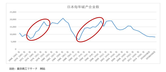 1968年,日本已经成为一个比较发达的经济体。可以看到两个红色圈标注的地方,是两个非常明显的破产企业快速攀升的阶段,这两个阶段分别对应日本两个非常重大的经济周期和危机,左边这个是1973年全球性的石油危机,日本大量企业倒闭。右边这个是1990年,日本泡沫经济破灭,之后十年间,不断有日本企业倒闭,破产数量不断攀升。