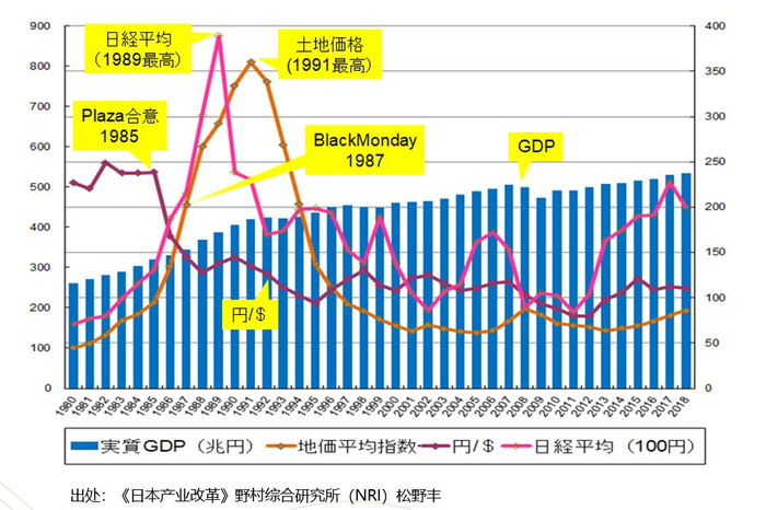 再从另一张图来看日本泡沫经济的实际情况。蓝色柱子是从1980年到2018年每一年GDP的总量,可以看到,在1990年日本泡沫经济破灭之后,GDP总量还是在逐步攀升的,当然攀升的速度越来越慢。从这个角度也可以看出,日本的经济在GDP层面并没有萎缩。