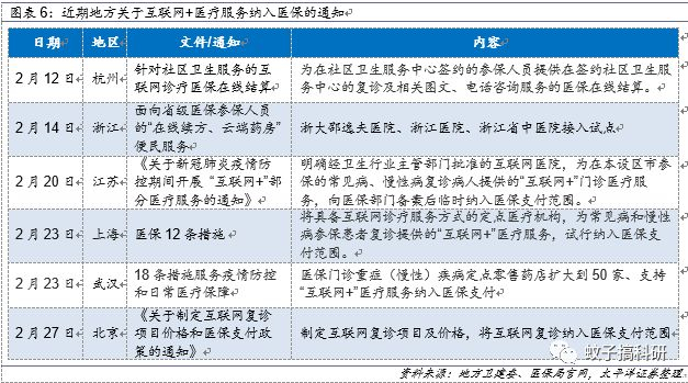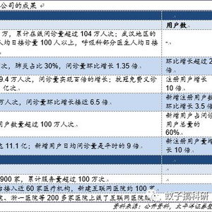 叠加政策的大力推进,2020年2月5日和8日,卫健委连续发布“加强信息化支撑新型冠状病毒感染的肺炎疫情防控工作的通知”和“在疫情防控中做好互联网诊疗咨询服务工作的通知”,要求医疗机构大力开展互联网诊疗服务,2月26日,国务院印发《关于开展线上服务进一步加强湖北疫情防控工作的通知》,提出加强远程医疗服务、推进人工智能服务等要求。